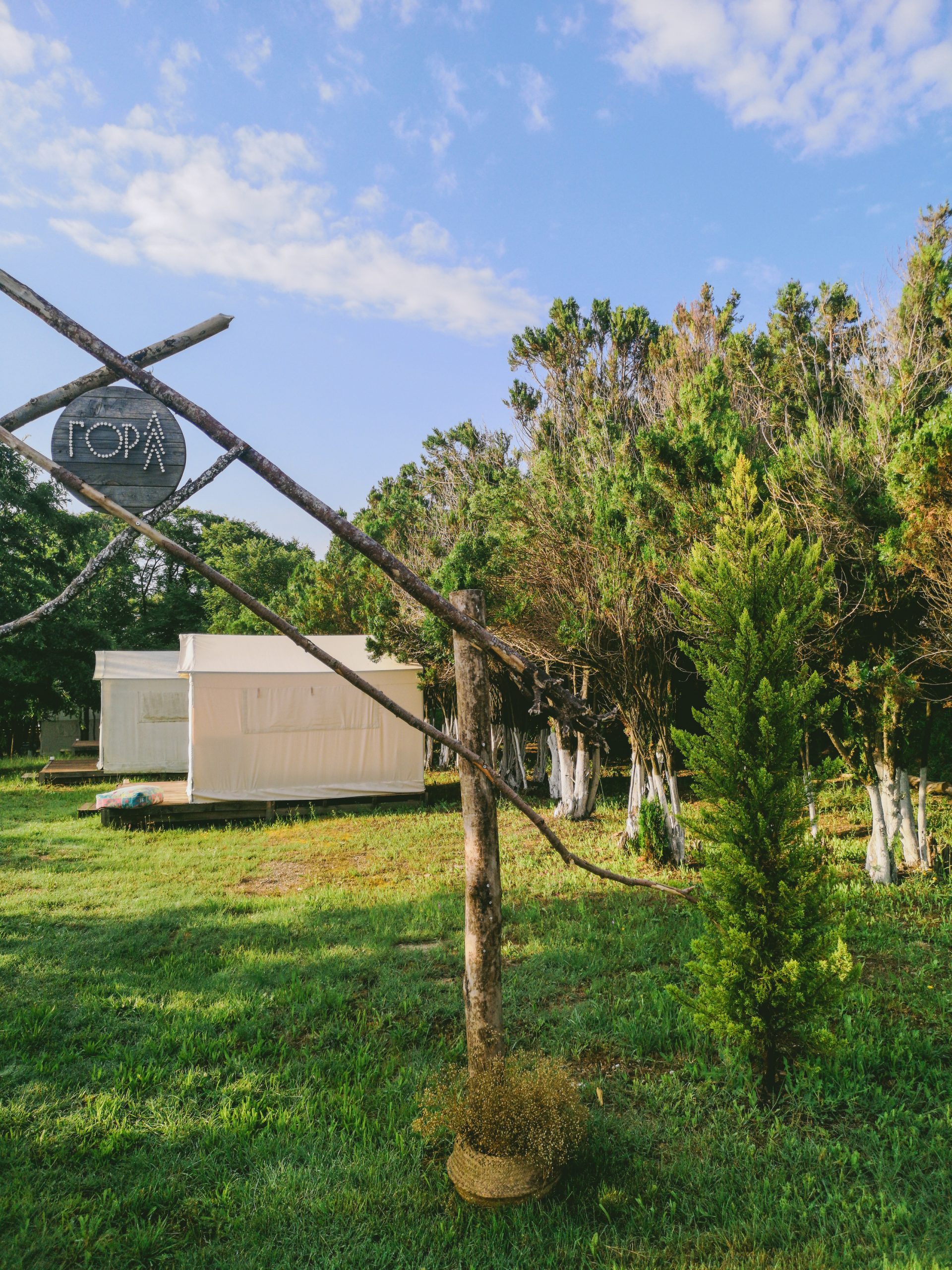 Глемпингът е разположени сред малката иглолистна горичка на къмпинга и се състои от 15 луксозни палатки, разположени само на метри от морето. Палатките са подходящи за двама души, като има опция за две отделни легла или спалня. Всяка от палатките се заключва с катинарче, като освен това са защитени от насекоми, дъждоустойчиви и електрифицирани. Леглата са изключително удобни, а освен тях в палатките ще откриете още 2 стола, 2 малки нощни шкафчета (ако мога да ги нарека така) и органайзер за дрехи (от тези, които се слагат в гардеробите), където може да “наредите” багажа си.